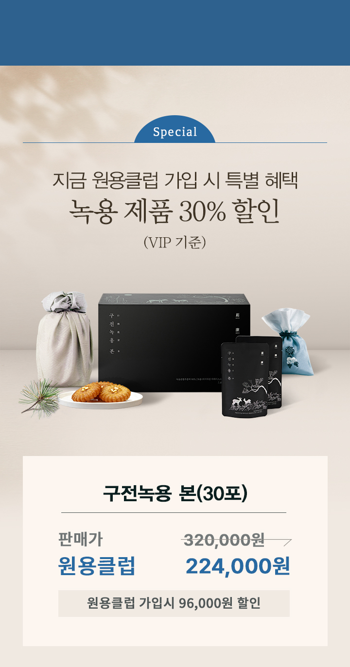 지금 원용클럽에 가입하시면 녹용 제품 30% 할인을 받으실 수 있는 특별혜택이 있습니다.(VIP 기준)