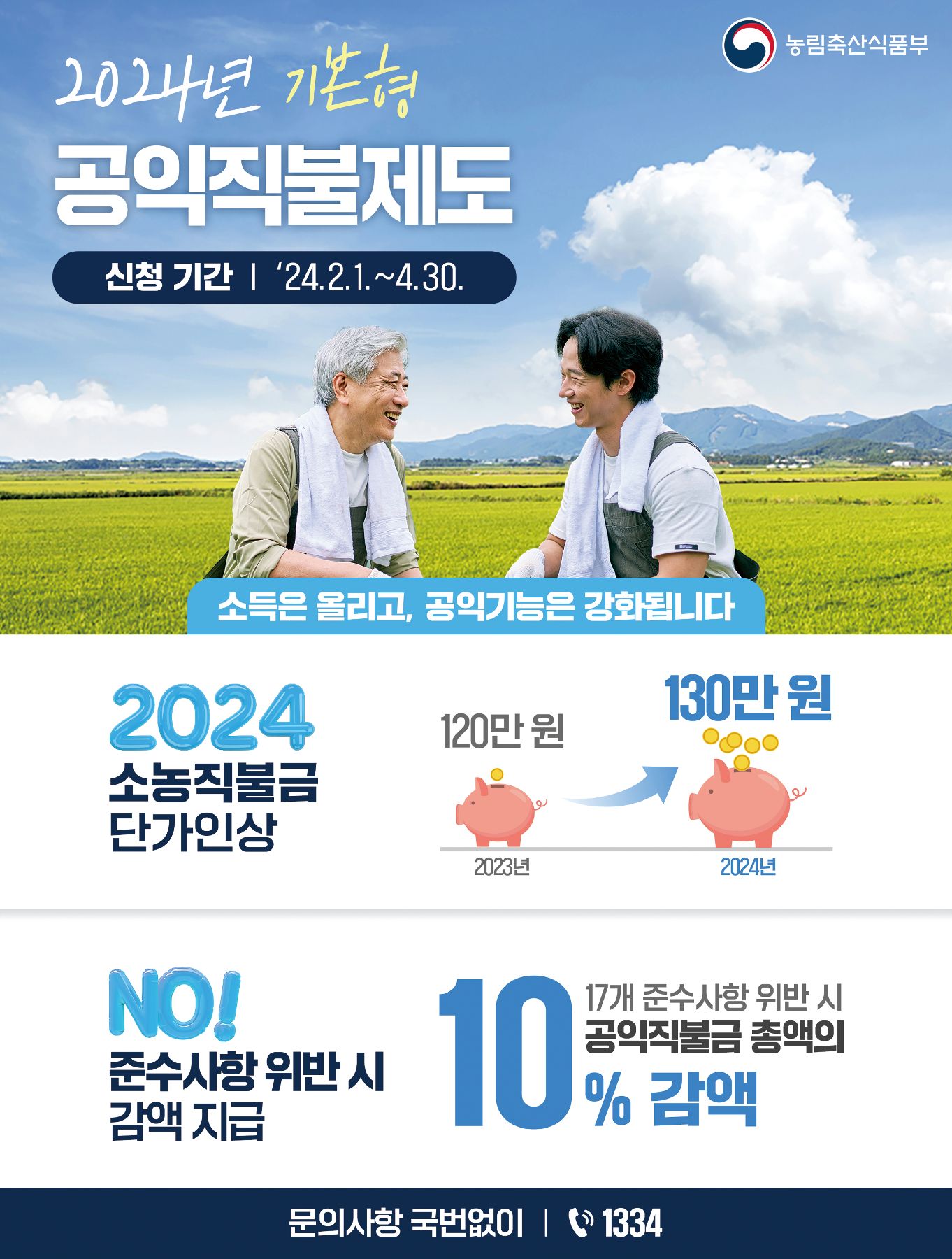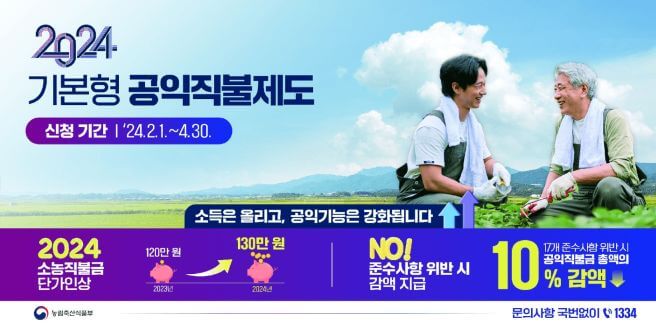 2024년 기본형 공익직불금 비대면 신청이 2월부터 시작됩니다. 공익직불금에 대해 알아보고 공익직불금 신청자격, 신청기간까지 알아보시고, 반드시 미리 신청자격을 확인하셔서 신청하시고 불이익을 받지 않으시면 좋겠습니다.올 해는 소농직불금이 120만원에서 130만원으로 인상되었으니 반드시 신청하시기 바랍니다.